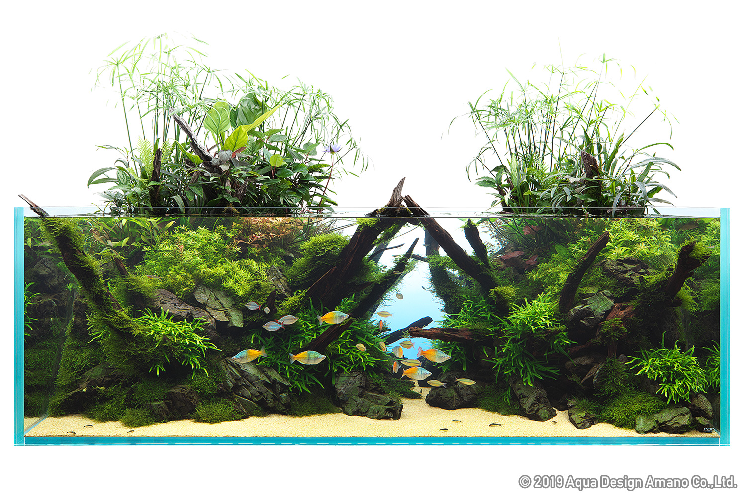 The master of Nature Aquarium, Takashi Amano proposed a new layout style for waterfront scenery in his later years. He incorporated an element of Nature Biotope, which recreates waterfront scenery outdoors, into a layout and expanded the layout from underwater to above water. This layout was produced in that style. Tropical waterfront scenery is portrayed by planting emergent plants, such as Cyperus alternifolius, primarily with various jungle plants in the above water section. In addition, the tropical water lily with floating leaves on the water surface enhance the waterfront ambiance and adds the fun of enjoying flowers as well.