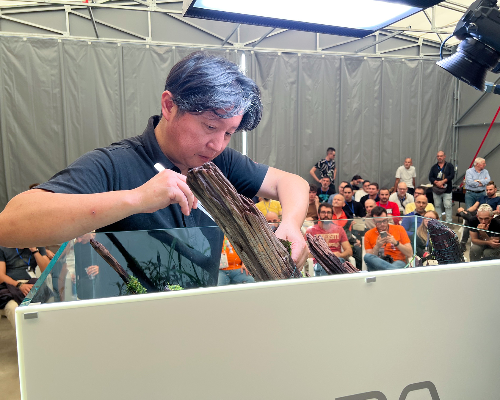 Homma’s layout concept drew inspiration from a nature walk he took the day before, exploring the landscapes around Padua. Using a rich variety of aquatic plants, he created a layout that evoked a peaceful underwater world, designed to inspire a sense of environmental awareness for future generations. Through casual conversation and audience feedback, the layout evolved into something truly co-created — a shared experience between the artist and the viewers.
