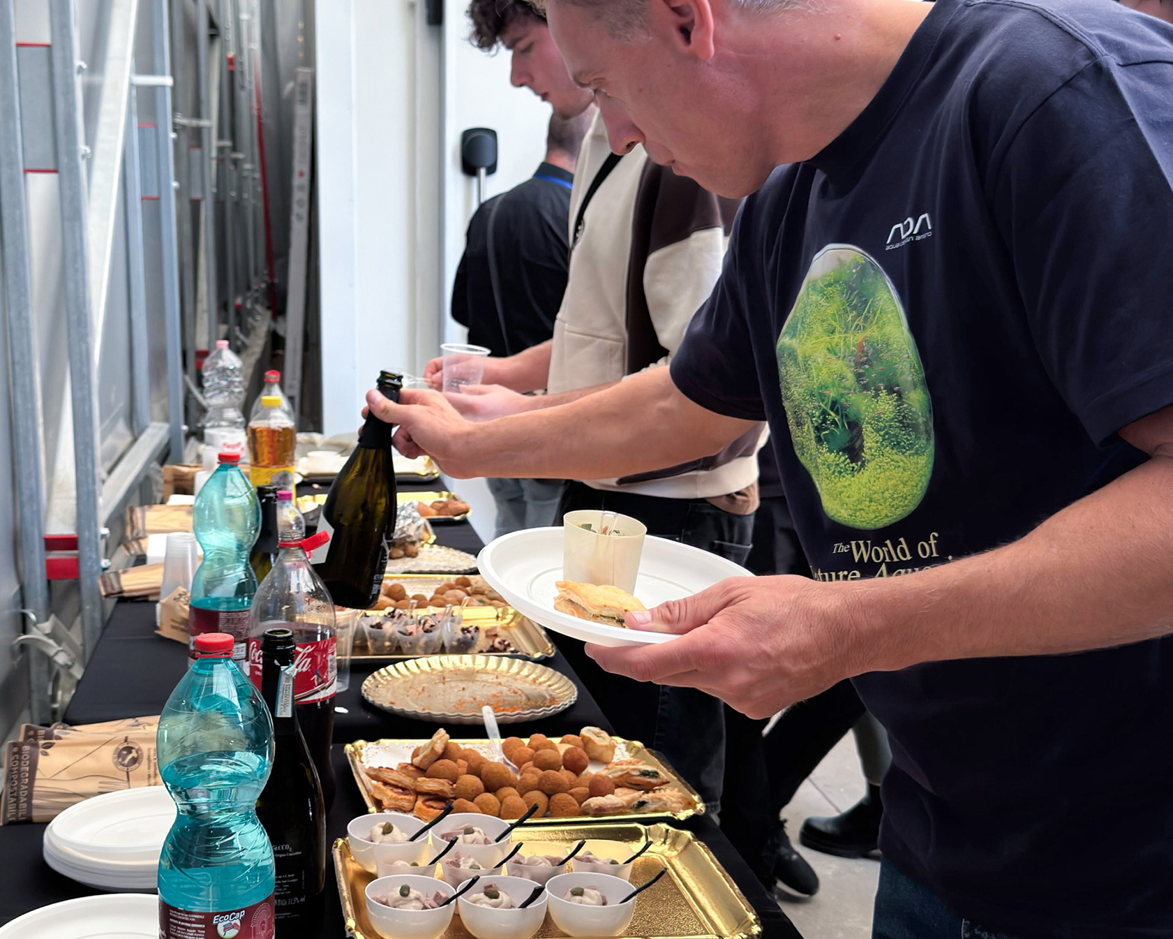 As the event began, some audience members joined in preparing aquatic plants for the layout, creating a relaxed and collaborative mood. While the staff kept an eye on the clock, this was, after all, Italy. Guests waited patiently, enjoying lunch and sipping Spritz, the classic northern Italian aperitif — a scene full of charm and warmth.