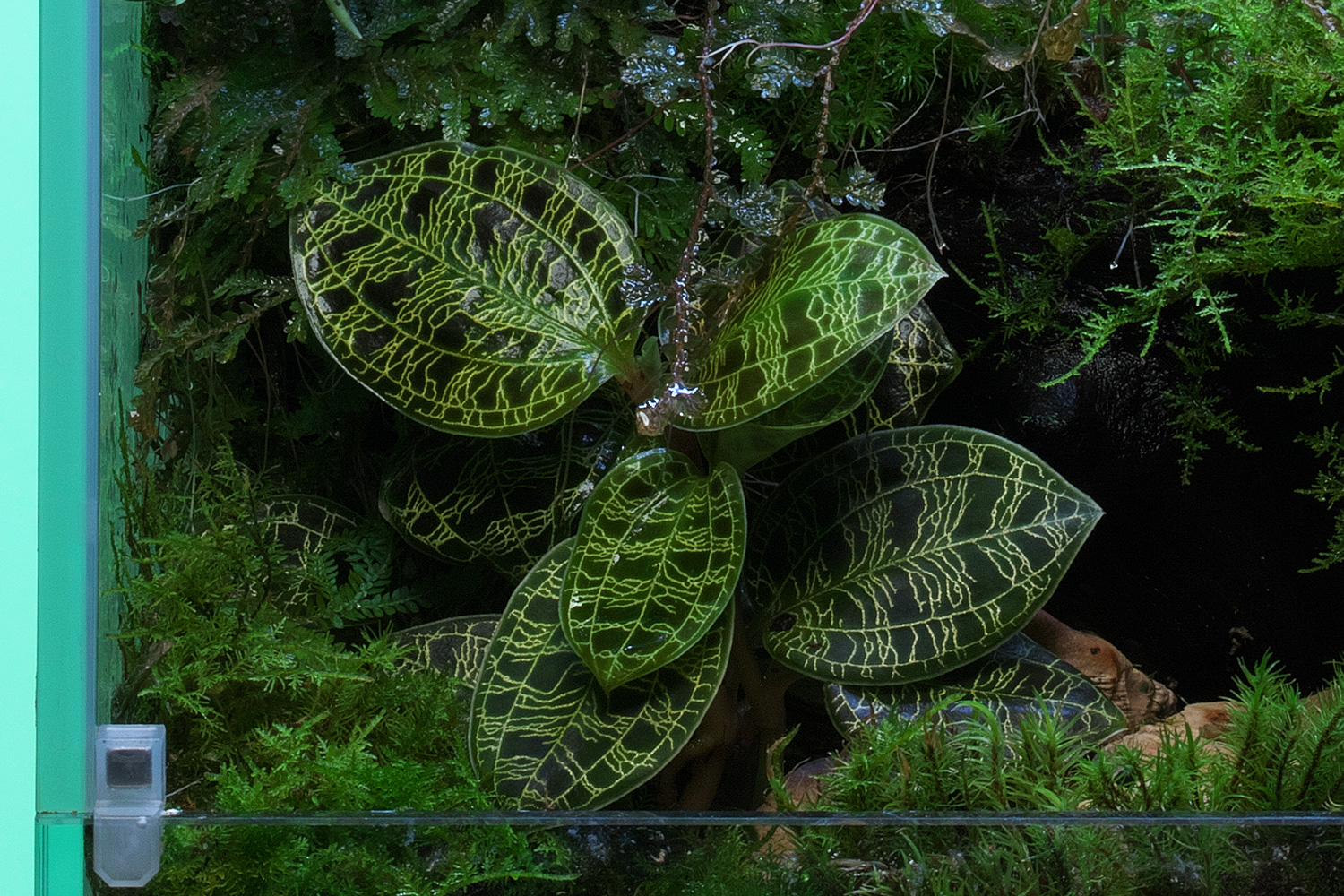 A classic jewel orchid species distinguished by golden veining set against deep green leaves. Naturally found in moist, shaded forest floors, it adapts well to low-light conditions. When planted in shadowed areas of the layout, the contrast of its leaf patterns becomes even more striking.