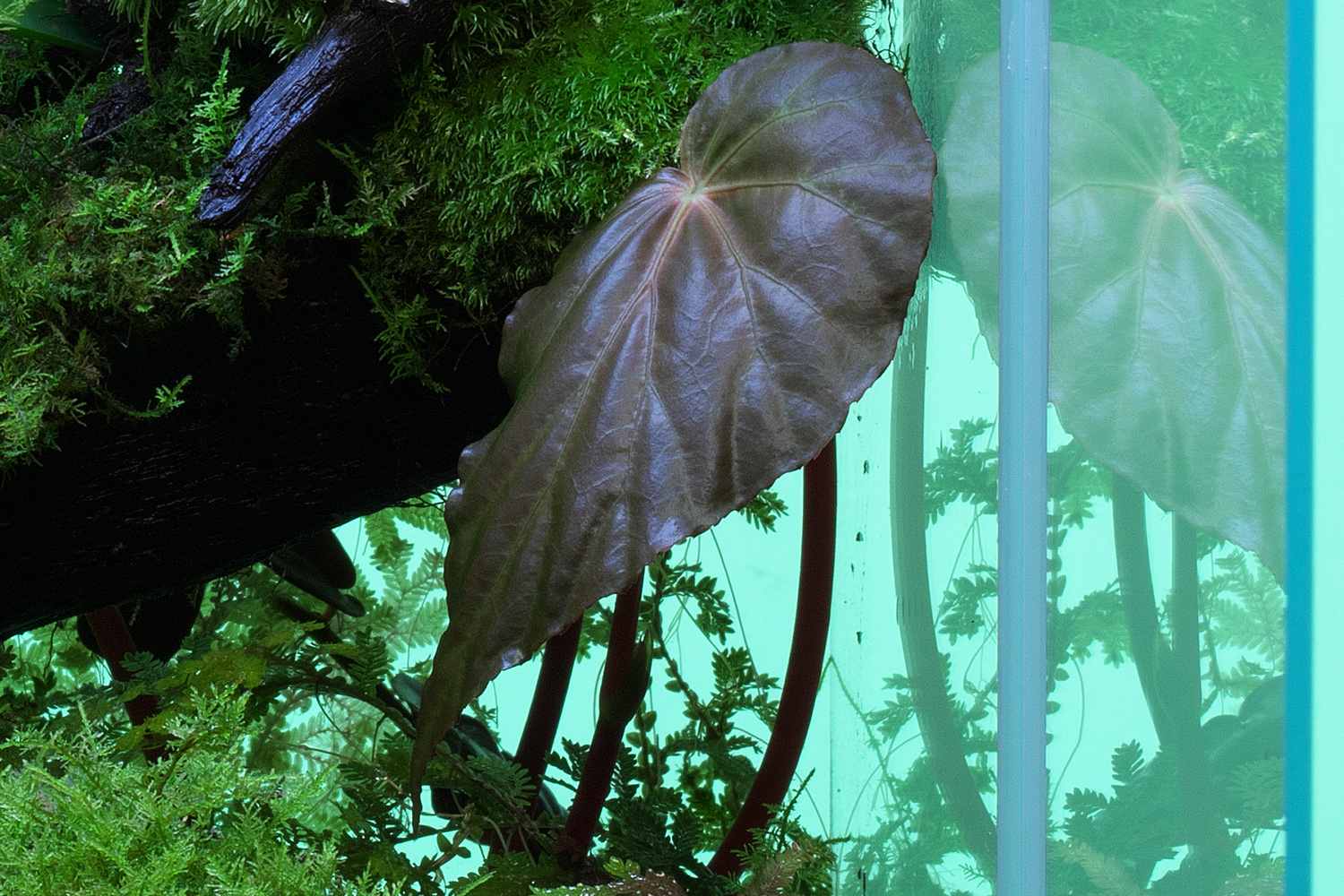 This begonia is known for its blue iridescence, which shifts with the angle and intensity of light. The softer the lighting, the stronger the blue sheen becomes. Like Macodes petola, it benefits from being planted in the shade of driftwood and grown slowly to fully develop its coloration.