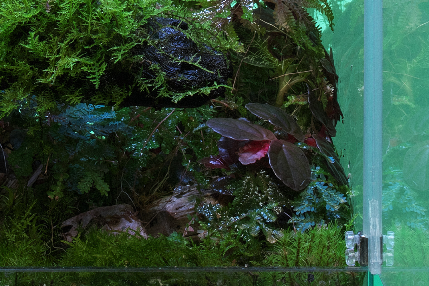This paludarium presents a macro-style snapshot of branches stretching and intersecting through space, richly covered with thriving plants. The vegetation grows as if naturally embracing the three-dimensional structure, evoking both the inherent beauty of nature and its quiet sense of acceptance. By introducing window-like openings, the composition maintains strong plant growth while softening any feeling of visual density. Taking advantage of the Neo Glass Paluda design—where the rear panel is glass rather than a solid wall—this layout deliberately preserves a sense of depth and openness, making negative space an effective part of the overall composition.