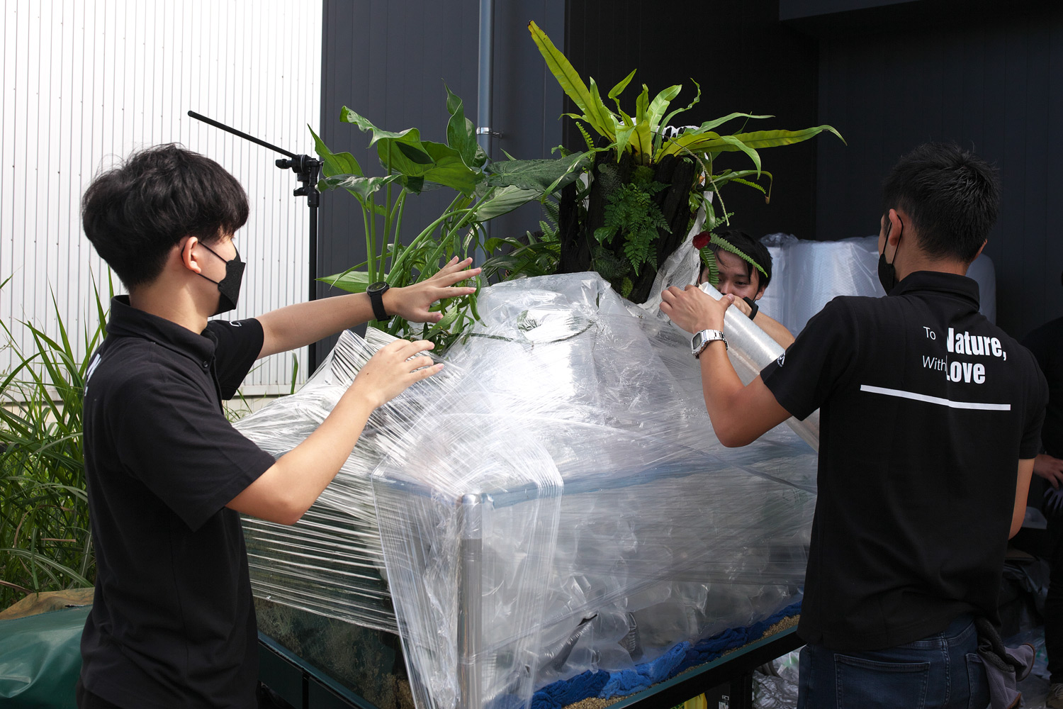 To transport the aquarium tanks safely without spoiling the layouts, we prepared hand trucks designated for each aquarium and a transport ramp. Because we needed to transport aquatic plants while maintaining their conditions, we had to pack everything carefully and speedily as staying focused. These arrangements can be done because past experiences are accumulated in the whole team. We arranged total 9 special wing type refrigerated trucks with air suspension function.