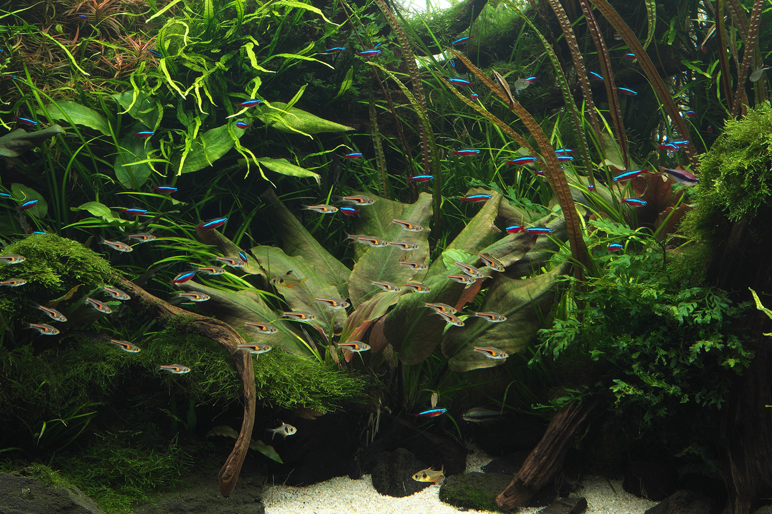 This aquarium was maintained over a long period of 18 months, and careful balancing of feeding amounts and plant biomass kept water quality stable. Water changes once every 10 days were sufficient.