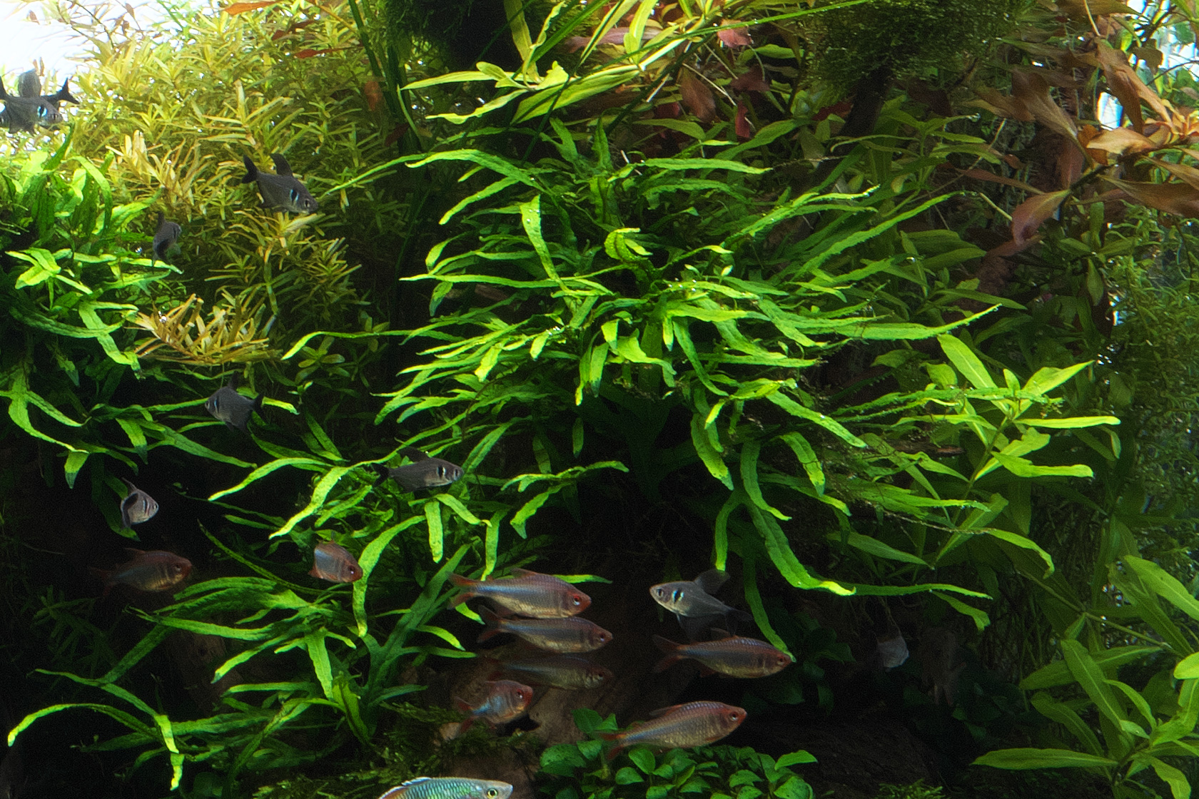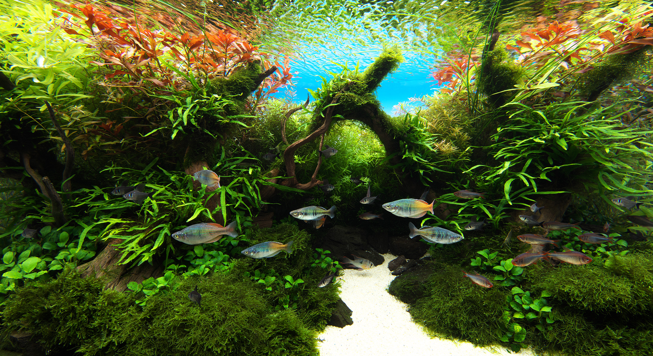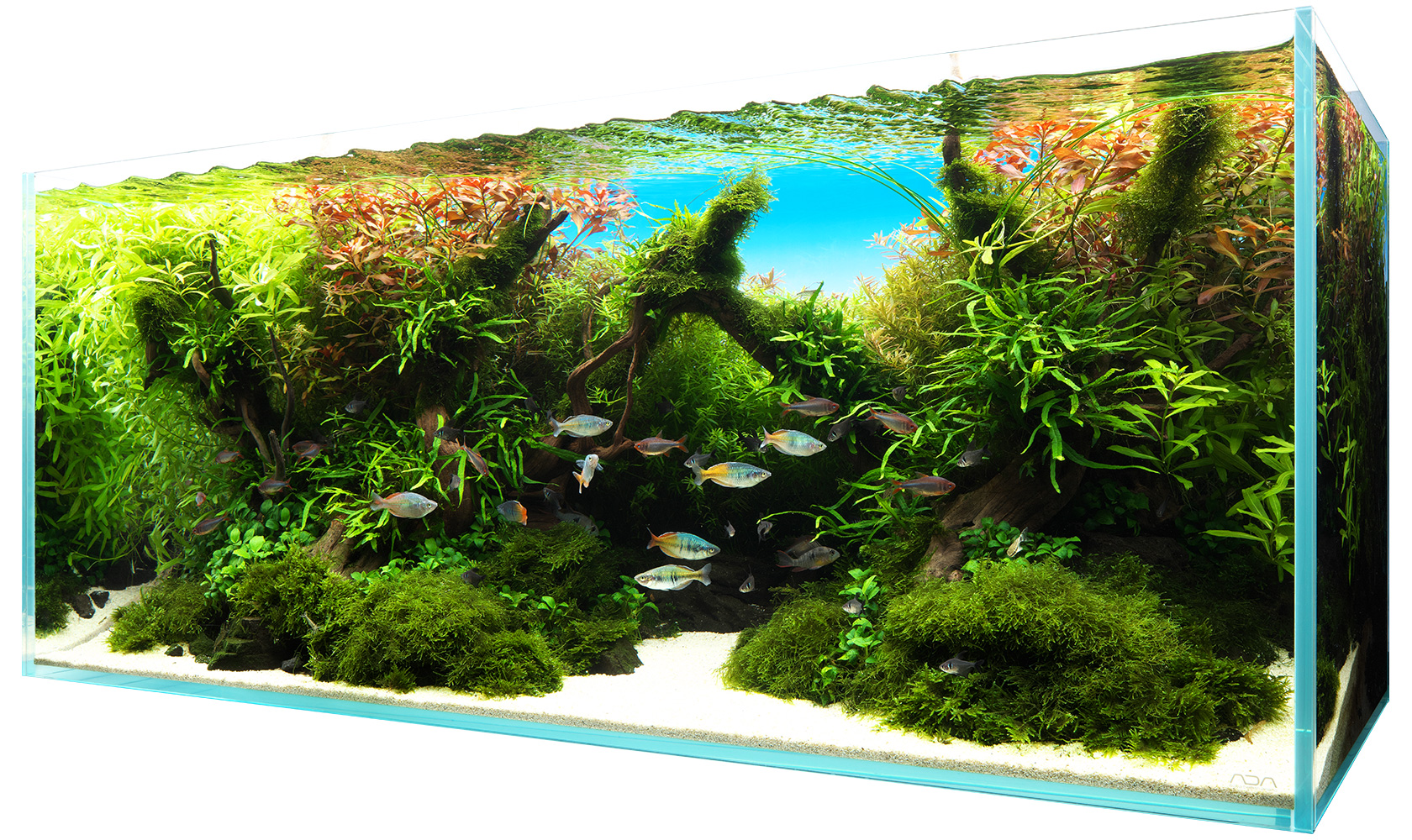 As a child, I spent countless hours catching fish in the river near my home, watching them intently in moments of stillness. Following those memories, this aquascape was created with the aim of providing a comfortable environment for fish, while also offering viewers a scene that brings a sense of calm and peace. Beneath the shadows cast by lush aquatic plants and driftwood, fish naturally gather, settling into a life of quiet security. Within this setting, they reveal their innate swimming behavior and vibrant natural coloration. The work stands as a faithful expression of the core principles of the Nature Aquarium.