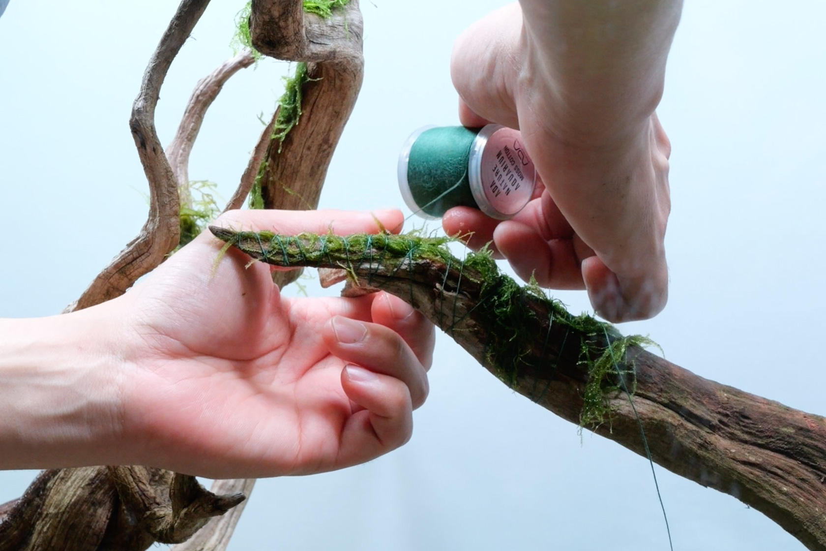 The tying line was wrapped in a crossing pattern at roughly 5 mm intervals, ensuring the moss was firmly secured and allowing for stable, long-term attachment. Because Taxiphyllum barbieri has a strong ability to attach, MOSS COTTON was used, while TERRA LINE was selected for peacock moss, which has a weaker hold. The tying materials were chosen to suit the characteristics of each moss species.