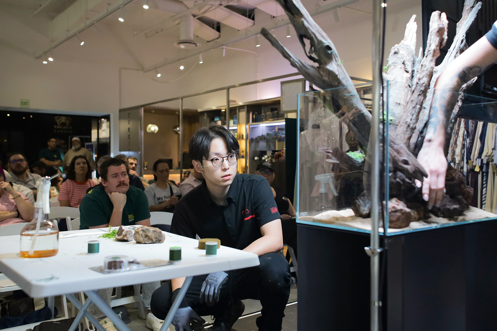 初日には、水草ミストウォール600を使用した制作実演が行われました。まず目を引いたのは、W600サイズのキューブガーデンには想像し難いほどの特大流木で、姿を見せた瞬間に会場から驚きの声が上がりました。大きな流木を大胆に突出させることで、省スペースでありながらひときわ存在感を放つエキゾチックな水草ミストウォールが完成しました。また、流木は側面のガラスに負荷を与えないように絶妙にバランスを調整しながら組まれています。