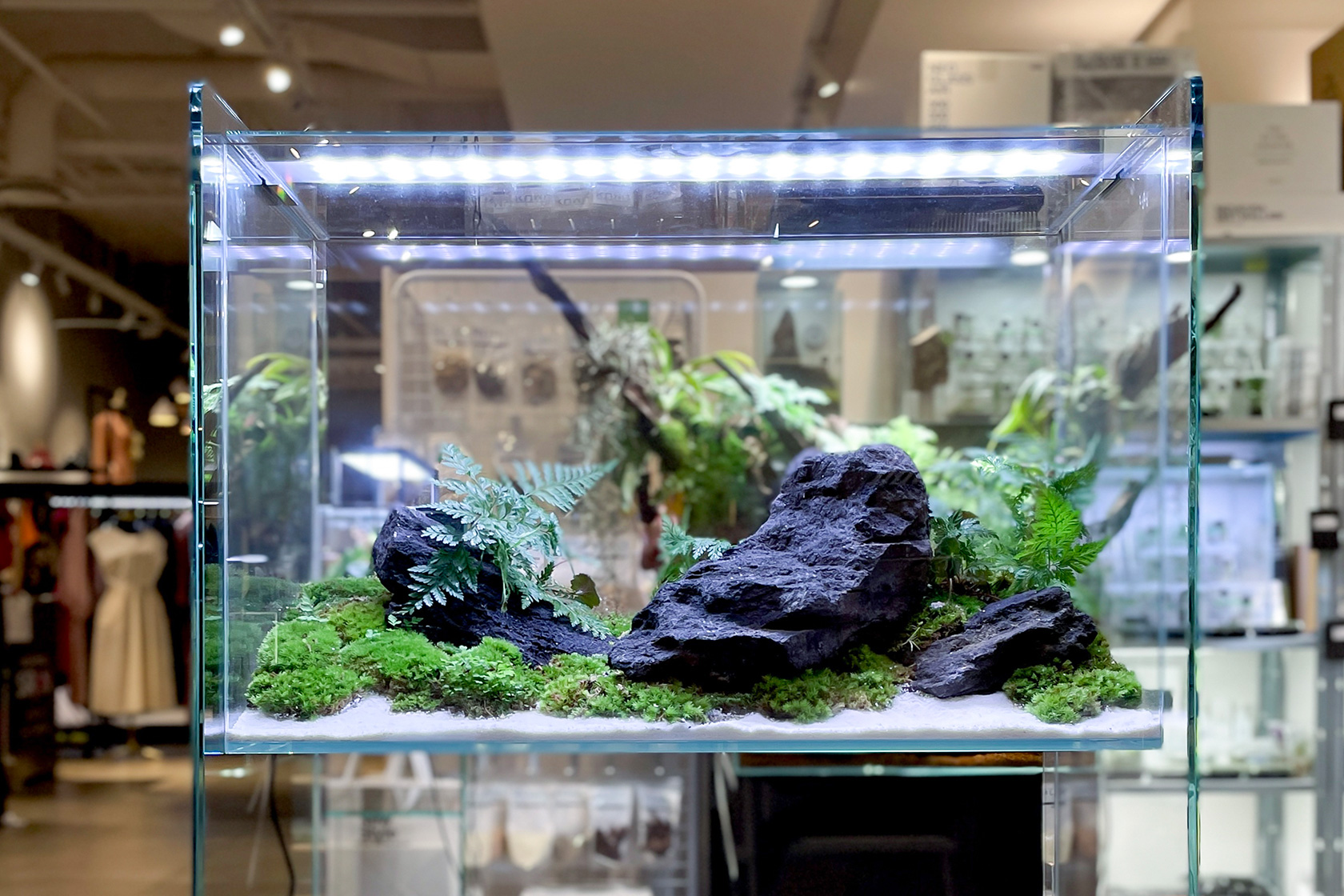 2日目は、新登場のグラスパルダ600を使用し、日本庭園を思わせるシンプルなパルダリウムが制作されました。前日の多種多様な植物で構成されたジャングルのようなミストウォールとは対照的に、引き算の美学を表現したレイアウトが披露され、2作品のコントラストが参加者を惹きつけていました。