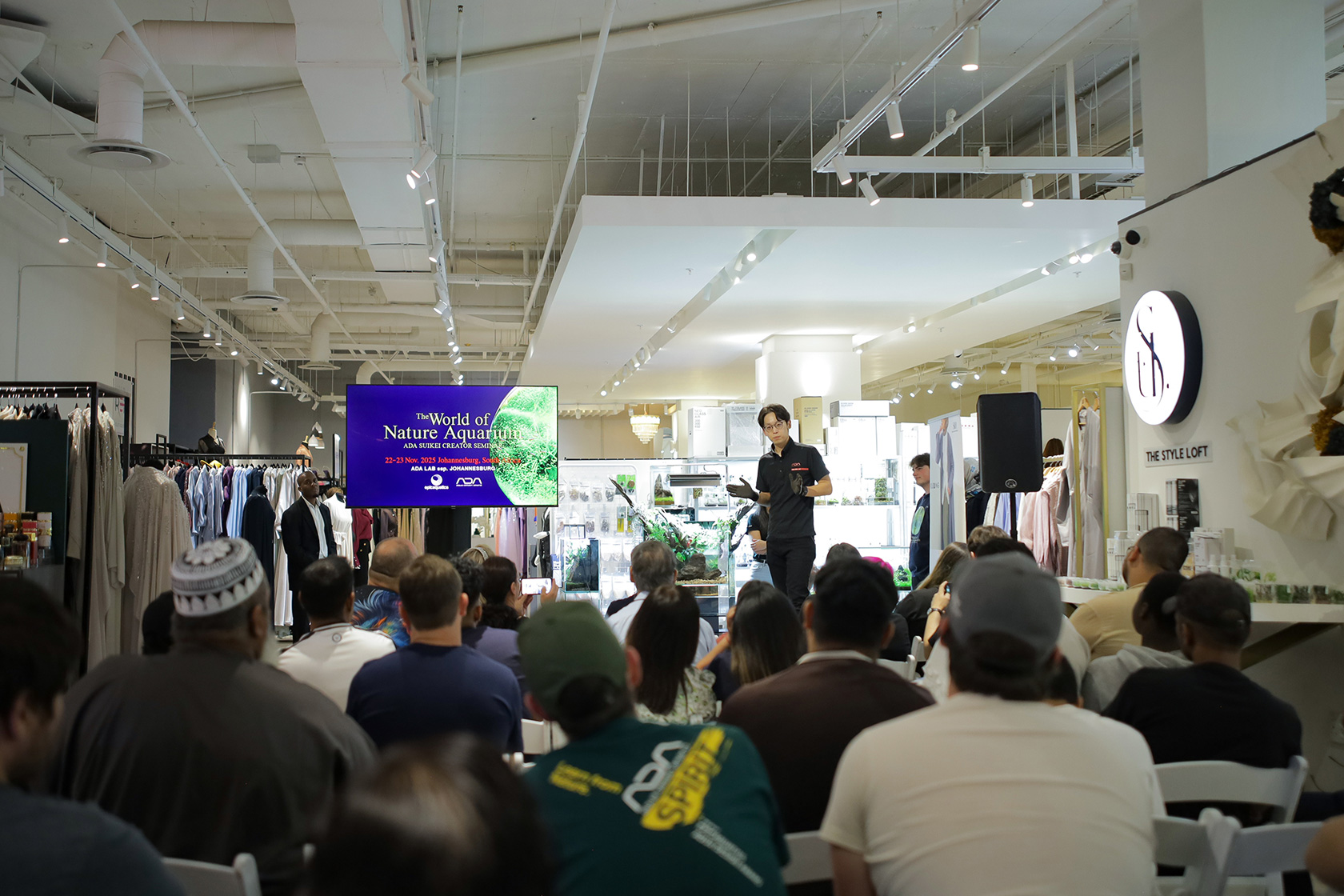 ADA水景クリエイター・荒木大智による、南アフリカで2度目となるADAイベントが、2025年11月22日、23日にヨハネスブルグで開催されました。会場となったADA LAB ssp. JOHANNESBURGは、アフリカ大陸で最もラグジュアリーなショッピングモールのひとつであるSandton City内に位置しており、南アフリカにおけるインドアグリーンへの関心の高さをうかがうことができます。
