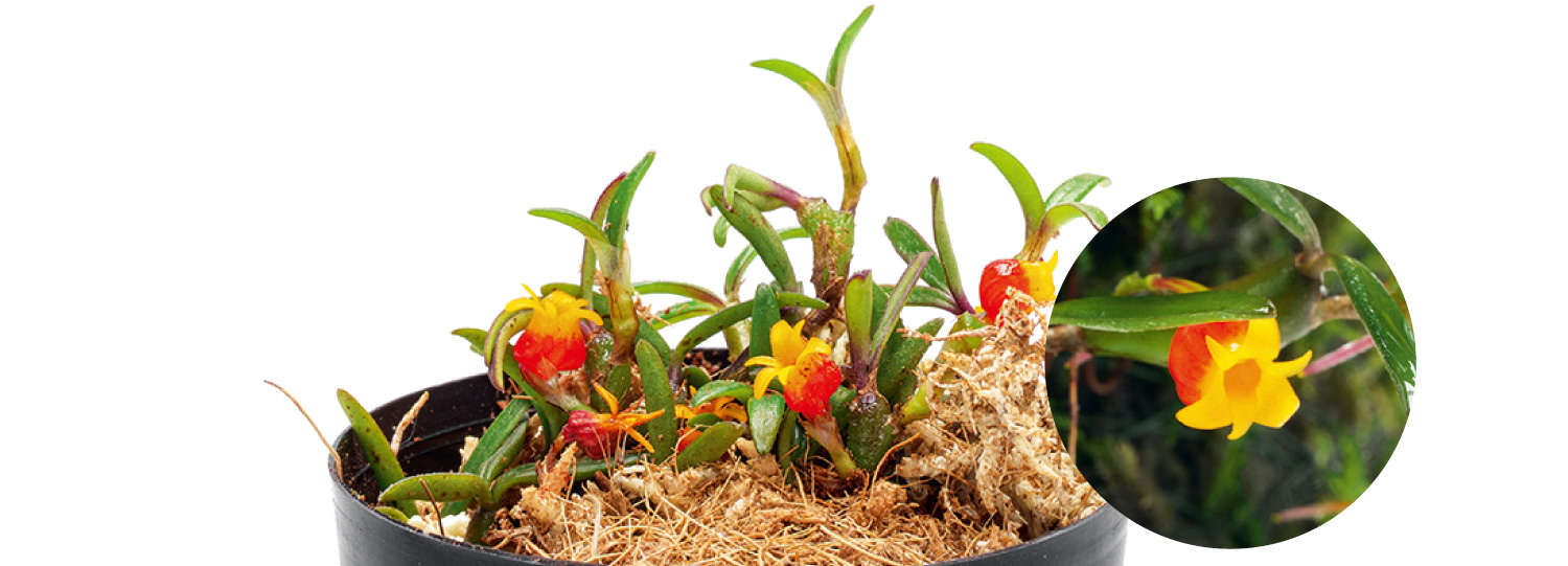 長楕円の葉の基部から小さな緋色の花を咲かせる。流木の窪みなどに座らせると可愛らしい。