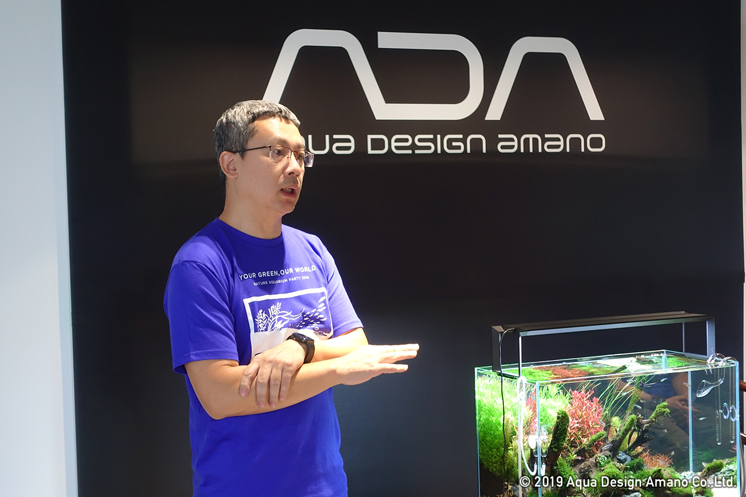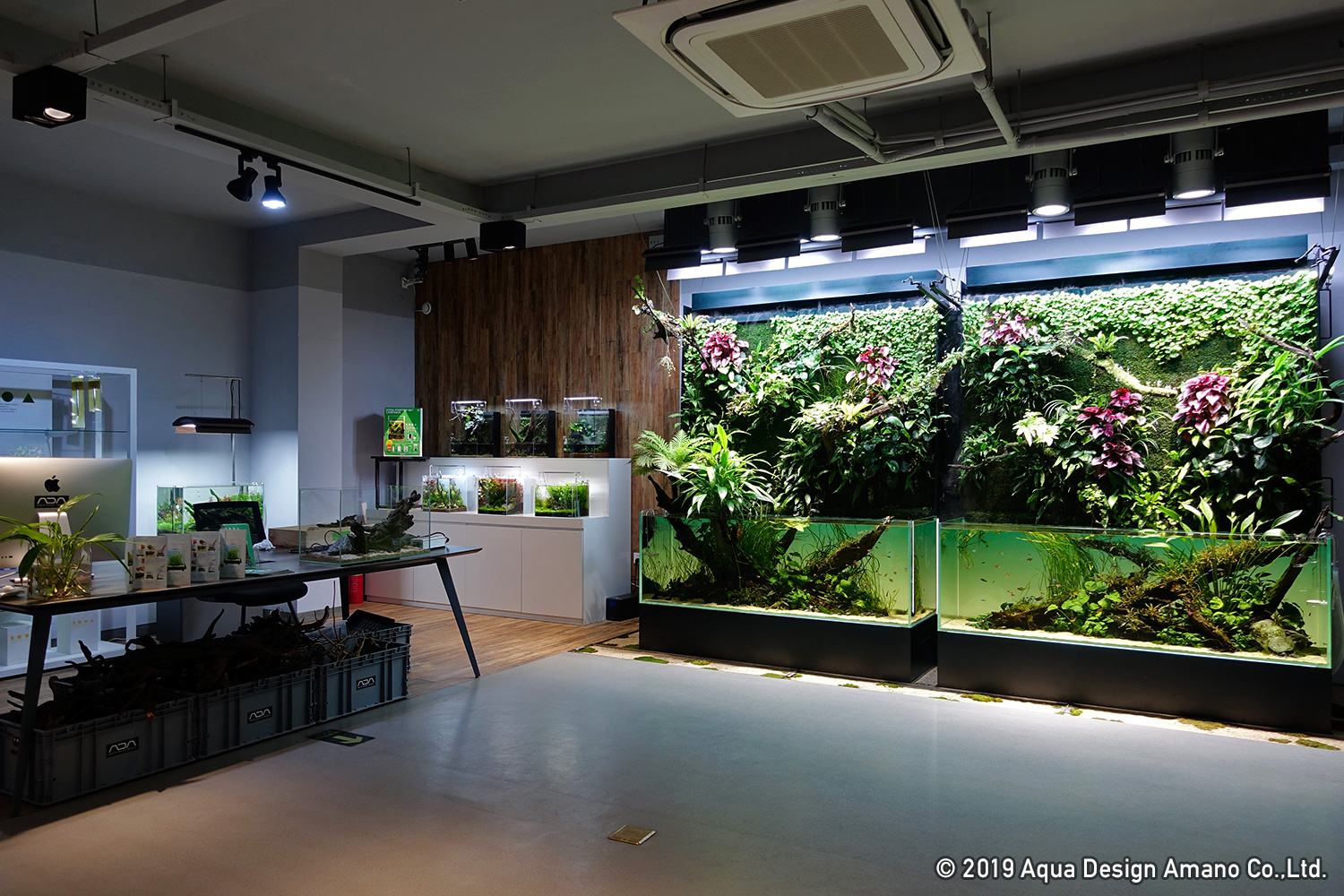 ギャラリー内には180cm水槽が2台並んだネイチャー水草ウォールを筆頭に大型水槽からDOOAの小型水槽に至るまで、ADAのほぼすべての水槽サイズがフルシステムで展示されています。今回の新製品発表会は、そうした美しい水景に囲まれながらのイベントとなりました。