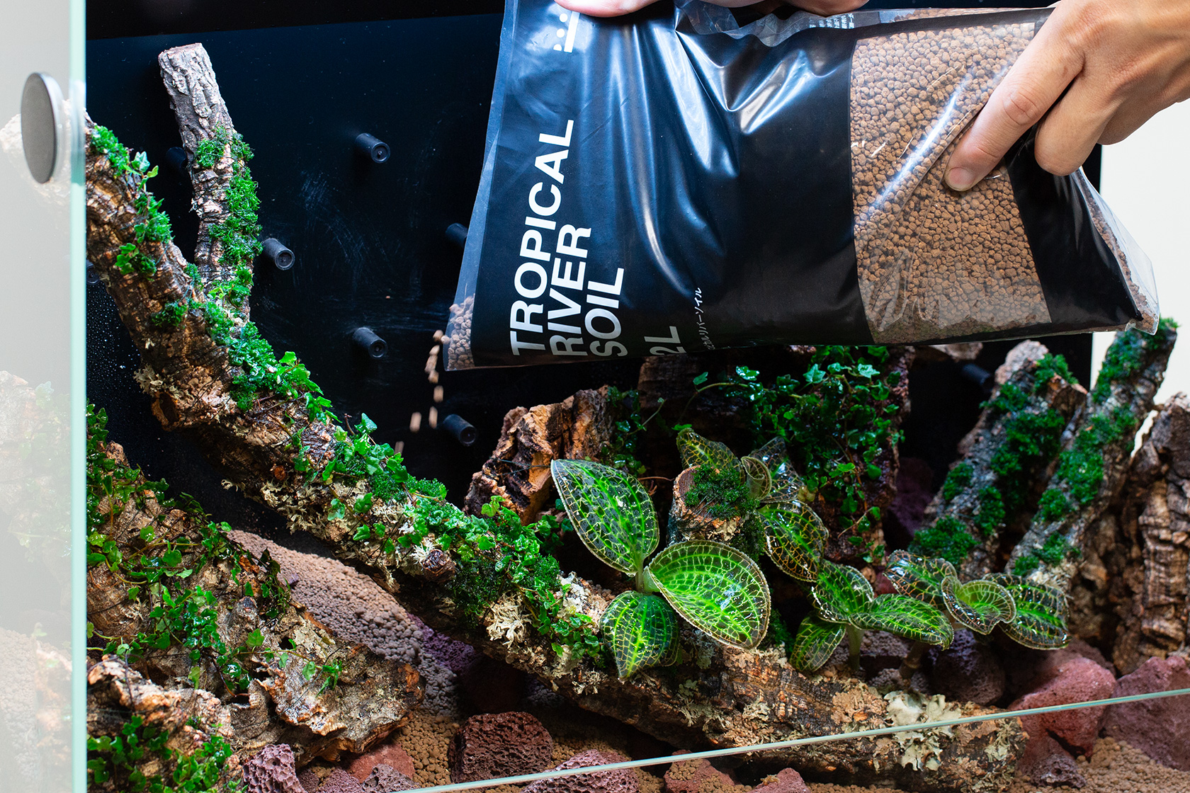 素材の隙間に追加でソイルを流し込み、植物の根元をしっかりと埋めます。隙間を埋めることで、構図素材の固定も期待できます。