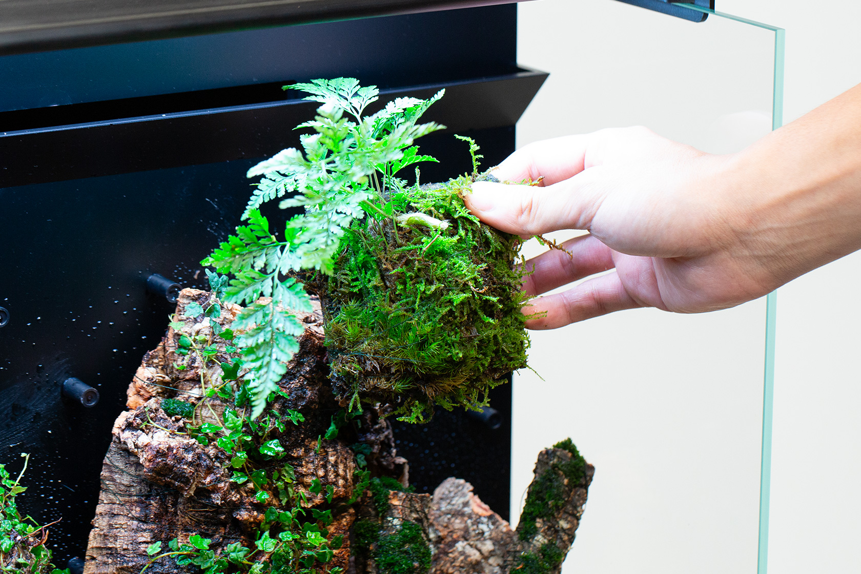 ④ メインプランツの植栽構図がある程度まとまってきたら、コルクの隙間にジュエルオーキッドを配植。主役を明確にすることで、全体のバランスが整えやすくなります。
