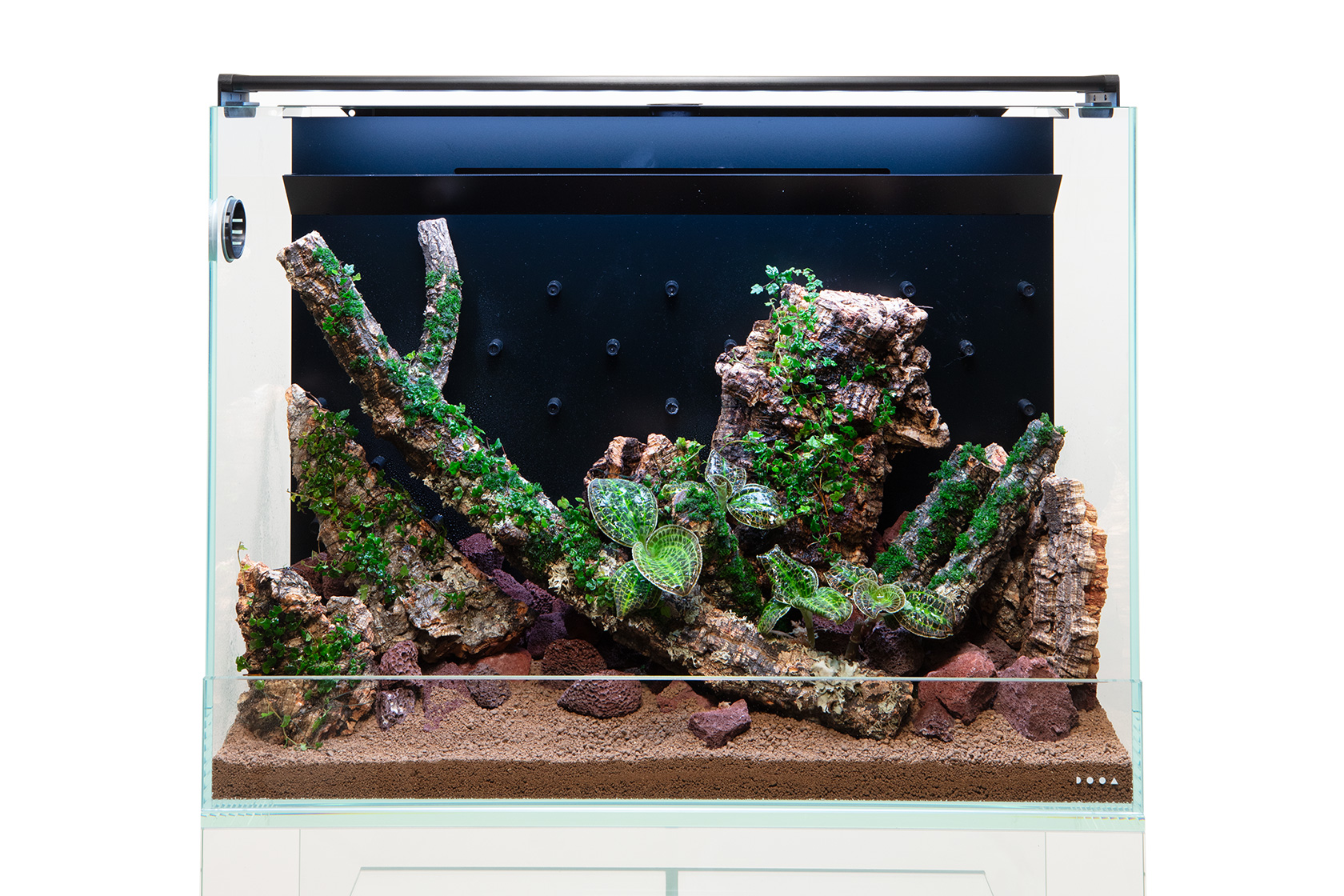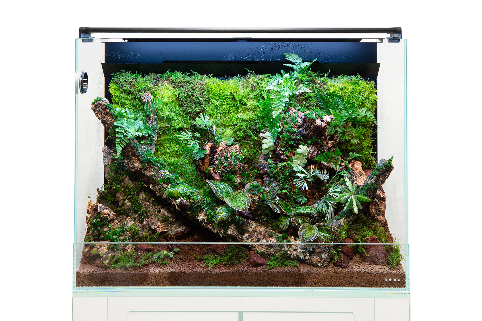 レイアウトの中心に据えたジュエルオーキッド、マコデス・サンデリアーナは、光沢ある葉脈が林床の小さな宝石のように静かに存在感を放つ。子株を伸ばしながら広がる姿には、時の流れを映す穏やかさがある。また、構成的には下層に重心を置き林床の密度を演出し、上層には佗び草マットのモスを配して余白の静けさを表現した。葉のフォルムが自然に浮かび上がるよう、光と影のコントラストにも配慮し、暖色系のソイルと石材で温もりある空間に仕上げている。