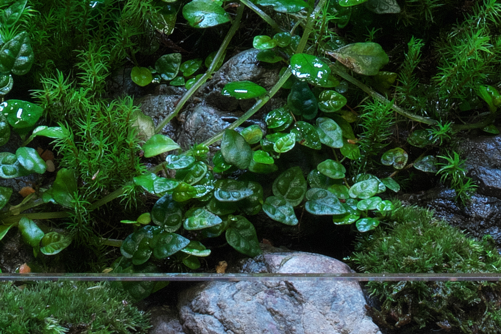 植物に覆われつつある石群は、まるで忘れ去られた遺跡の一角のような神聖な雰囲気を漂わせる。ガラスの中で石を積み上げ、隙間から苔や小さな植物が顔をのぞかせる構成にした。石は隙間を空けて接着し、その隙間に水苔を詰めて苔や植物を植栽することで、植物が石をゆっくりと包み込み、石を飲み込むように生長していった。さらに蔓状の植物を用いることで、時間の経過を表現した。