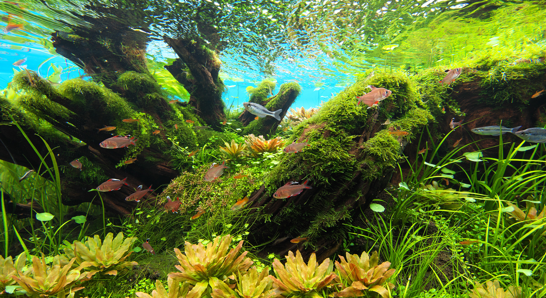 水景の中央部に広がる魚たちの集まる空間は、生命力にあふれ、賑やかな舞台のようだ。古い大樹は枯れ果てながらも魚たちの住処となり、生命の物語が永遠と続いていく様子を思い描きながら制作した。