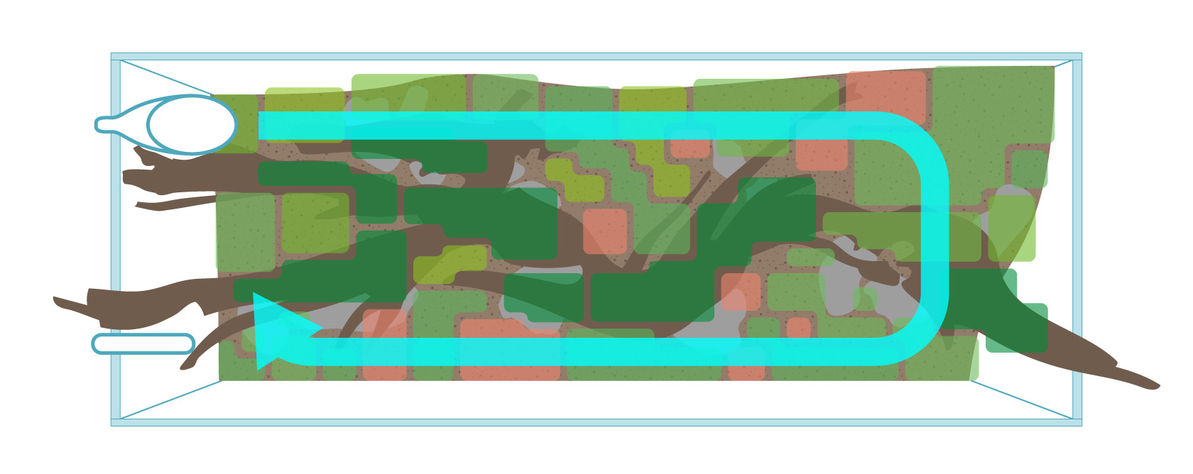 多様な葉形の水草を多く使用する場合は、水流の回り方に注意する必要があります。今回の水景では、構図や盛り土の関係で背面側が止水域になってしまう懸念がありました。そこで、リリィパイプの出水口を背面側に設置し、水の通り道を確保しつつ、テープ状の水草が柔らかく棚引くように調整しました。これにより、水の流れを視覚的にも感じられるレイアウトになっています。
