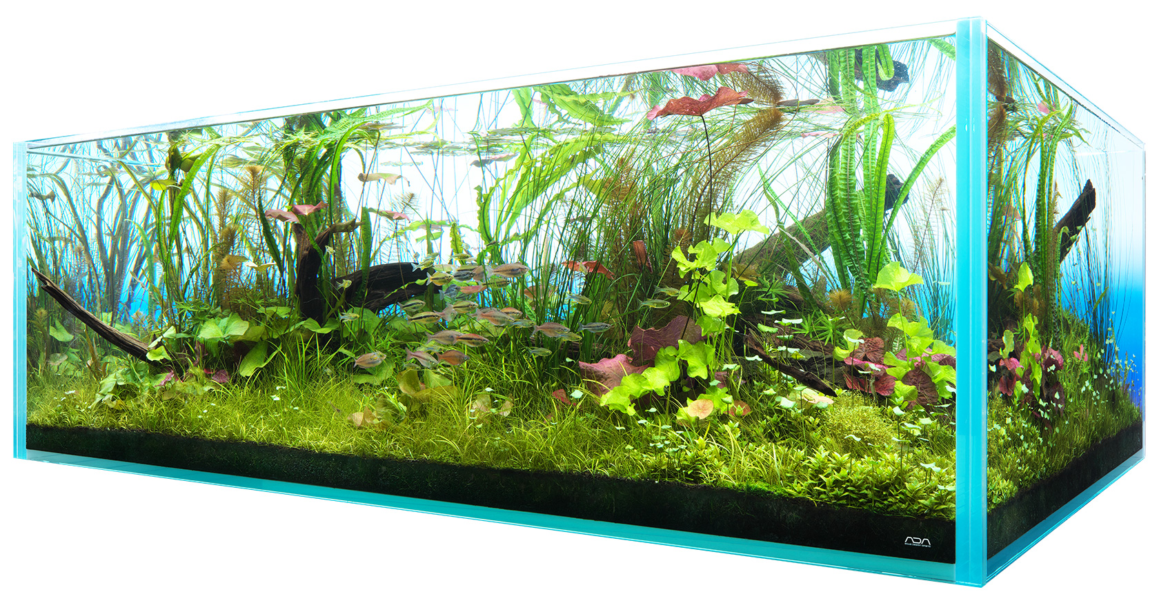 水槽は立方体で5枚のガラス板で構成されています。「水槽は正面から見るもの」という前提を離れ、ガラスならではの透明感を生かし、多方向からの視点を取り入れたレイアウトとして制作しました。