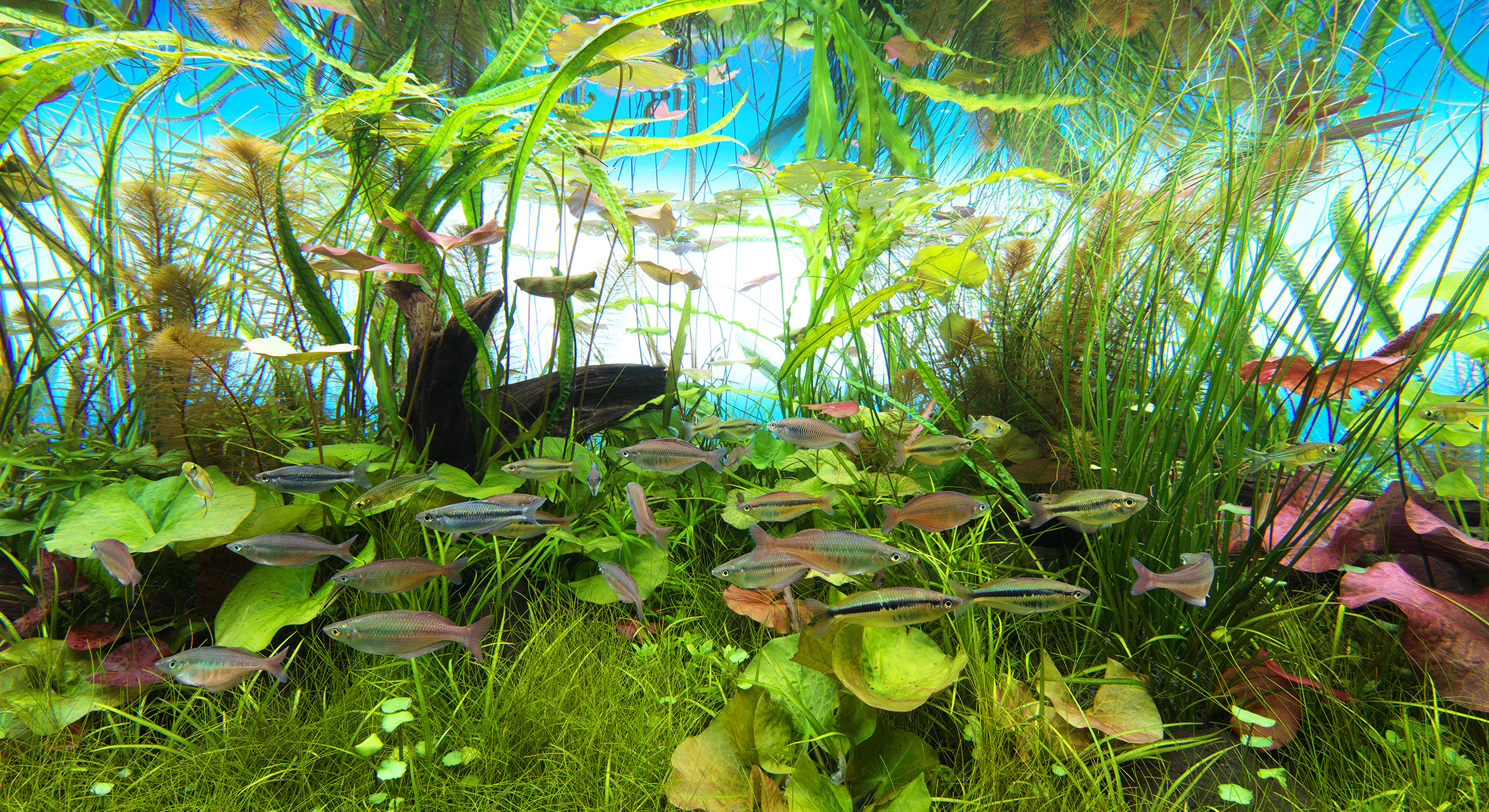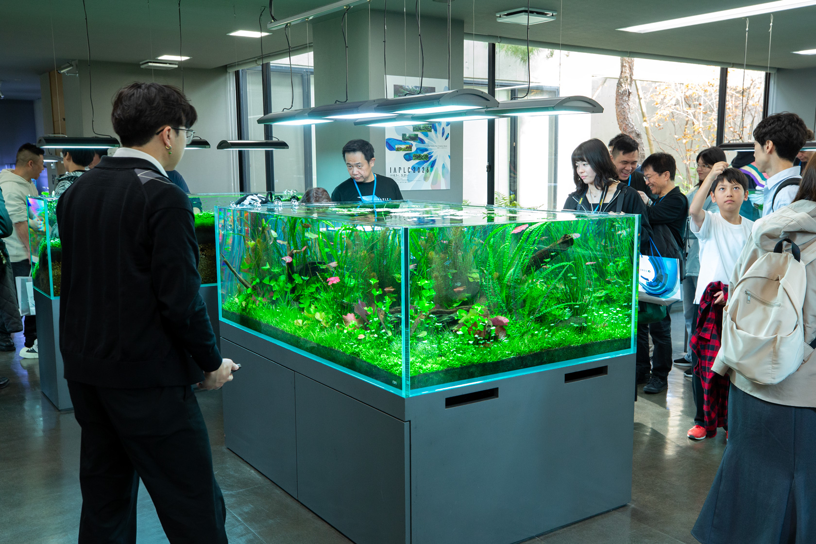 この水槽はネイチャーアクアリウムギャラリーのほぼ中心に位置しており360度お客様に見ていただくことになります。4面それぞれに鑑賞価値をつくるために構図や植栽でも余白を意識し、盛り土も行わないことで魚や植物を多方向に鑑賞することができる構成にしました。