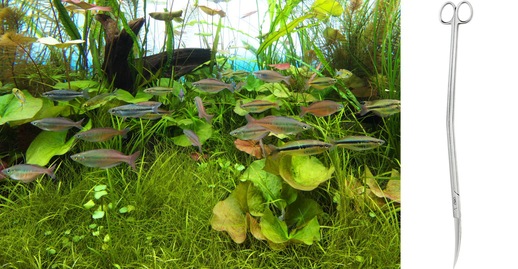 主役はスイレン科の植物。ボリュームが出てくるにつれて、他の植物に影を落として光を遮ってしまうこともあります。特に奥行き1,200mmの水槽では影響も大きいため、葉の一枚一枚を狙ってカットするように管理しました。トリミングは、主にプロシザーズ・ヌードを使用し、全体のバランスを整えています。また、根からの栄養吸収に頼る植物が多いため、3週間に一度を目安にボトムプラスで追肥を行いました。こうした積み重ねが、安定したコンディションの維持につながっています。