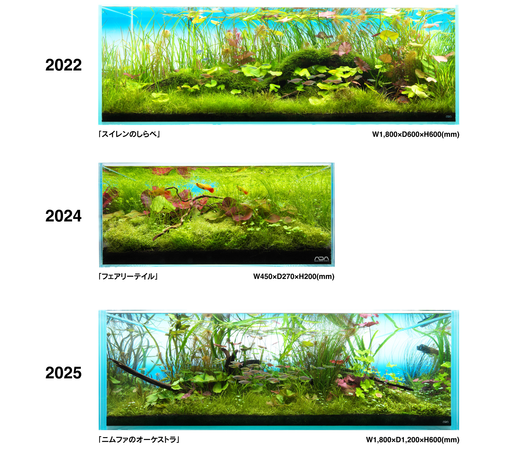 水面が大きく開けたこの水槽の特長を活かし、五面から観賞できるニムファが主役の水景である。音符のように並ぶ丸い葉と多彩な水草が水中にリズムを生み、穏やかな世界を描き出している。生長とともに景色が変わり、水が奏でる旋律を視覚で楽しむという試みである。