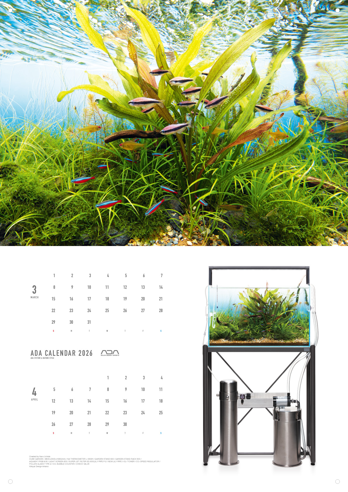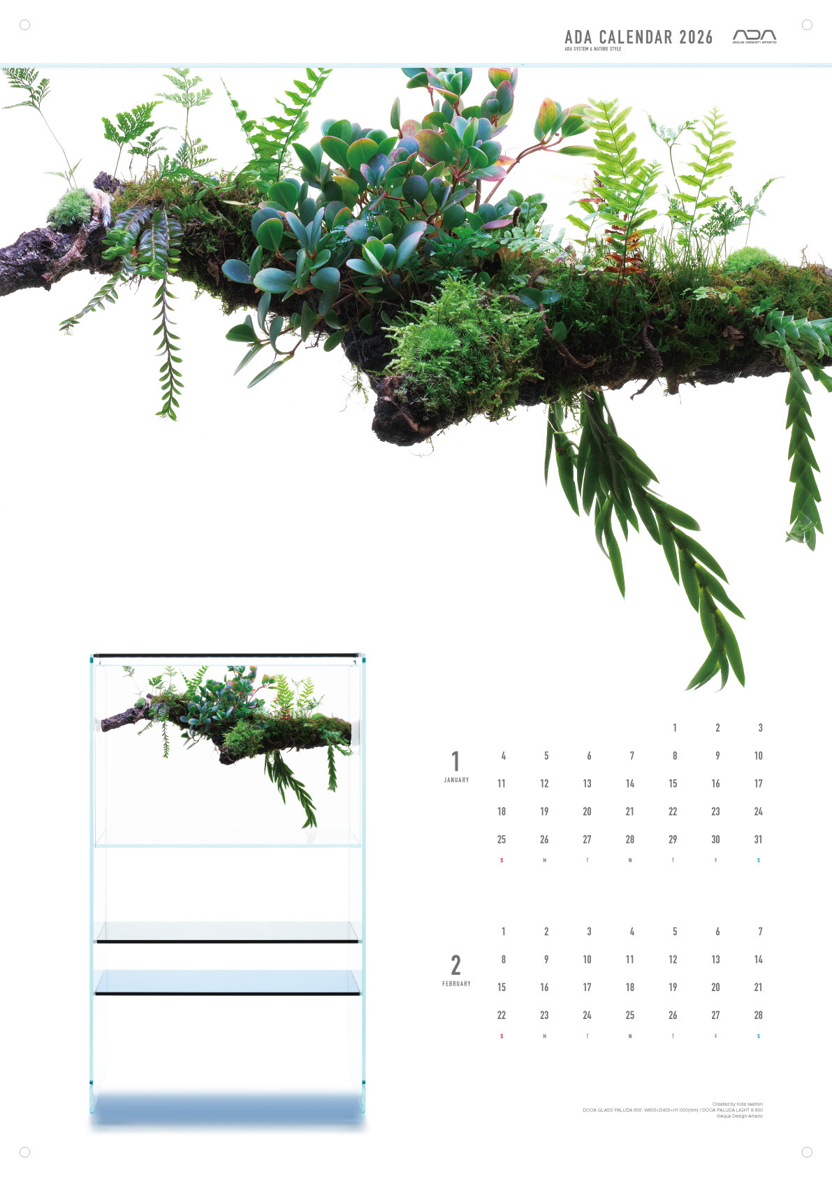 毎年ご好評をいただいているADAのカレンダーのカレンダーですが、来年用の「ADAカレンダー 2026」が発売になりました。今回のカレンダーは昨年から内容を一新し、ネイチャーアクアリウムの水景写真だけでなく、パルダリウムや水槽システムも掲載。最新のADAを感じていただける内容となっています。昨年同様、縦開き・つり下げ型のカレンダーです。ぜひ、お部屋に飾ってお楽しみください。
