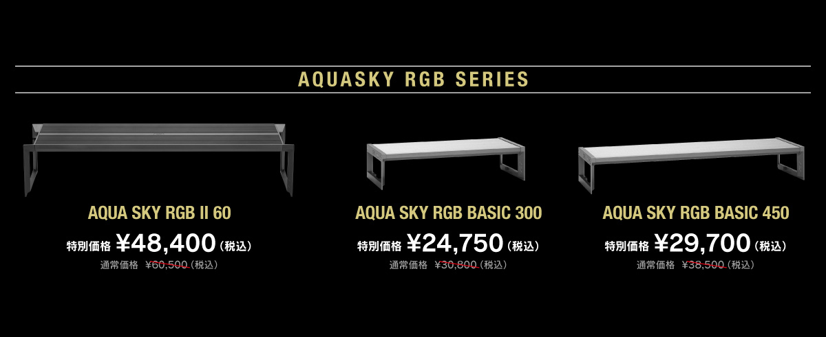 旧型ADA照明器具(販売終了製品)をお持ちのお客様対象に、現行の「アクアスカイ RGB」シリーズを、特別価格にて販売いたします。新しい光が、あなたの水景をさらに明るく、美しく照らします。明るさ・演出性・安全性がさらに進化した現行モデルを、ぜひこの機会にご体感ください。