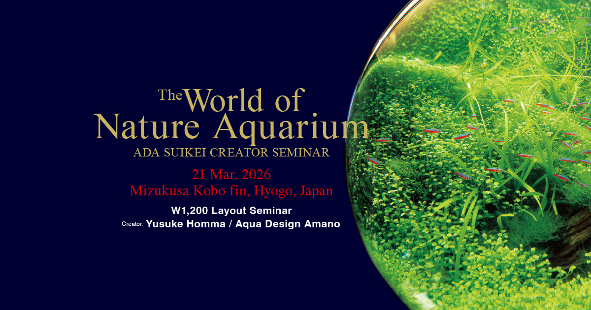 2026年3月21日(土)、兵庫県高砂市のADA販売特約店「水草工房fin」にて「The World of Nature Aquarium」を開催いたします。本イベントでは、ADA水景クリエイター本間 裕介が講師として出演し、キューブガーデン W1,200×D500×H500(mm)を使用した底床準備~植栽まで一連の工程をセミナー形式で実演いたします。構図の組み方や植栽方法など、各工程で制作のポイントを解説し、参加いただくお客様からの質問なども交えながら進行いたします。